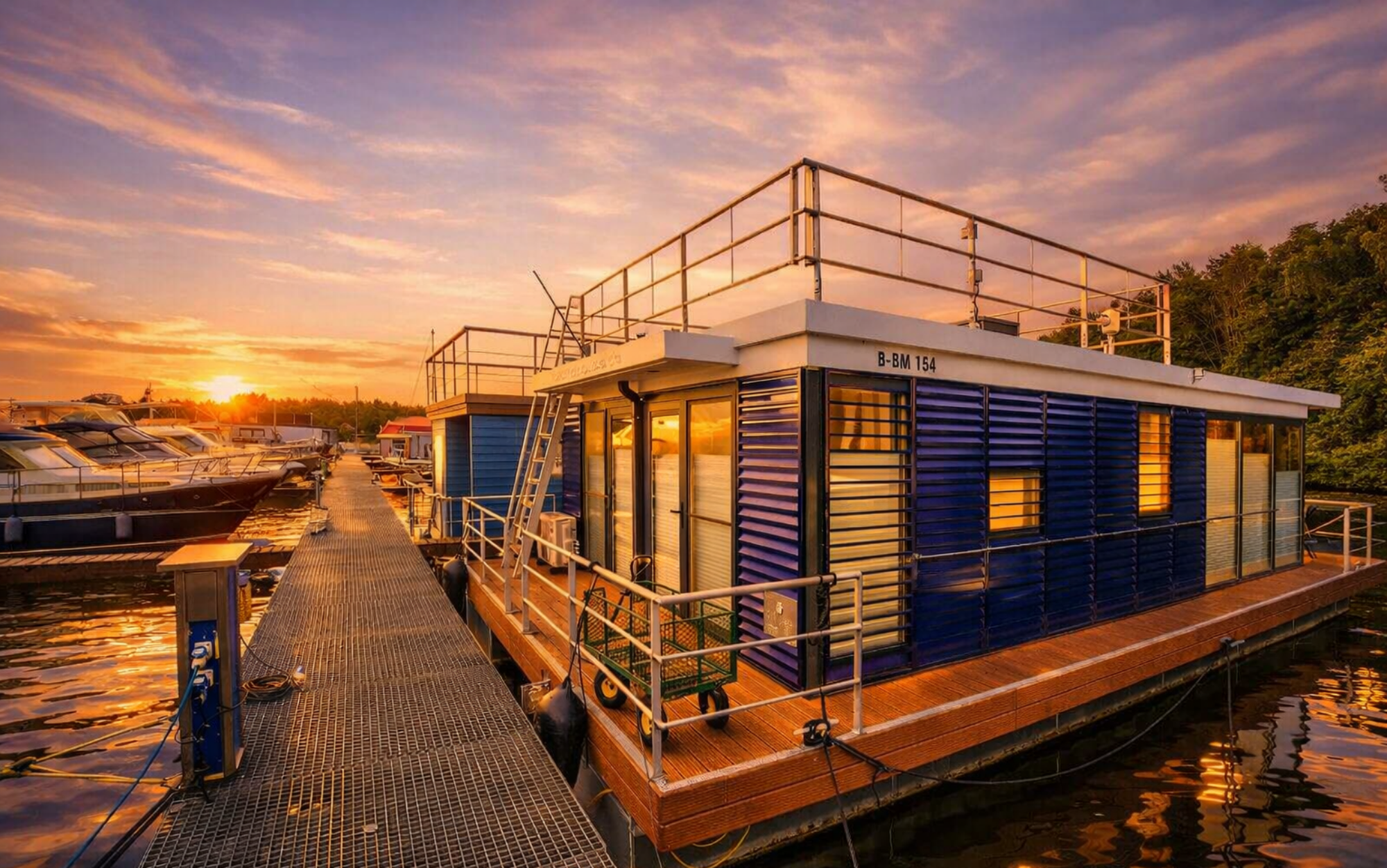 Ihrem schwimmenden Ferienhaus in Hennigsdorf, direkt vor den Toren von Berlin.